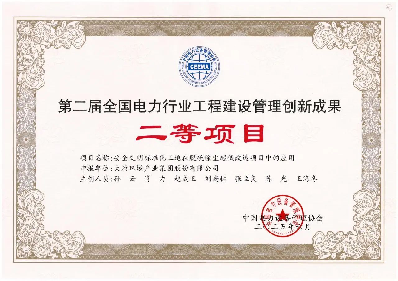 本網(wǎng)訊?近日,中國電力設(shè)備管理協(xié)會(huì)公布第二屆全國電力行業(yè)工程建設(shè)管理創(chuàng)新成果評選結(jié)果。大唐環(huán)境環(huán)保分公司雞西項(xiàng)目部申報(bào)的《安全文明標(biāo)準(zhǔn)化工地在脫硫除塵超低改造項(xiàng)目中的應(yīng)用》項(xiàng)目,憑借其在安全管理實(shí)踐中的顯著成效,獲二等項(xiàng)目獎(jiǎng)項(xiàng)。