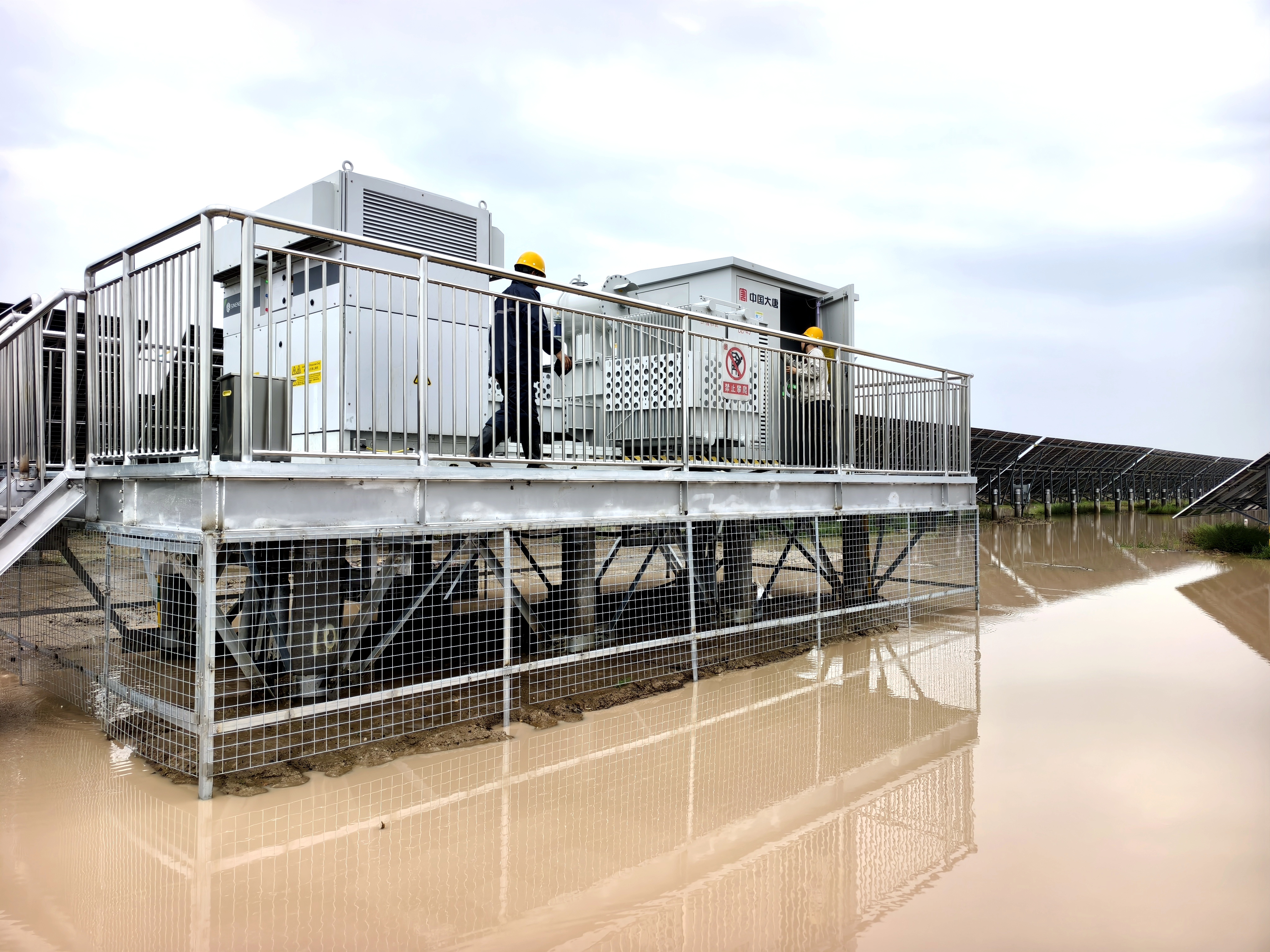 持續(xù)的強(qiáng)降雨導(dǎo)致托克托縣伍什家鎮(zhèn)呼和浩特鋁電公司36萬千瓦光伏電站廠區(qū)積水迅速上漲,部分區(qū)域形勢嚴(yán)峻?!皥?bào)告趙組長!二標(biāo)段集電電路7方陣86號匯流箱處積水深度已超警戒線,部分匯流箱基礎(chǔ)被淹!”對講機(jī)里傳來運(yùn)行值班員焦急的聲音。險(xiǎn)情就是命令!該公司新能源工程組組長趙大虎果斷下令:“立即啟動(dòng)防汛一級應(yīng)急預(yù)案!所有人員,進(jìn)入戰(zhàn)時(shí)狀態(tài)!”