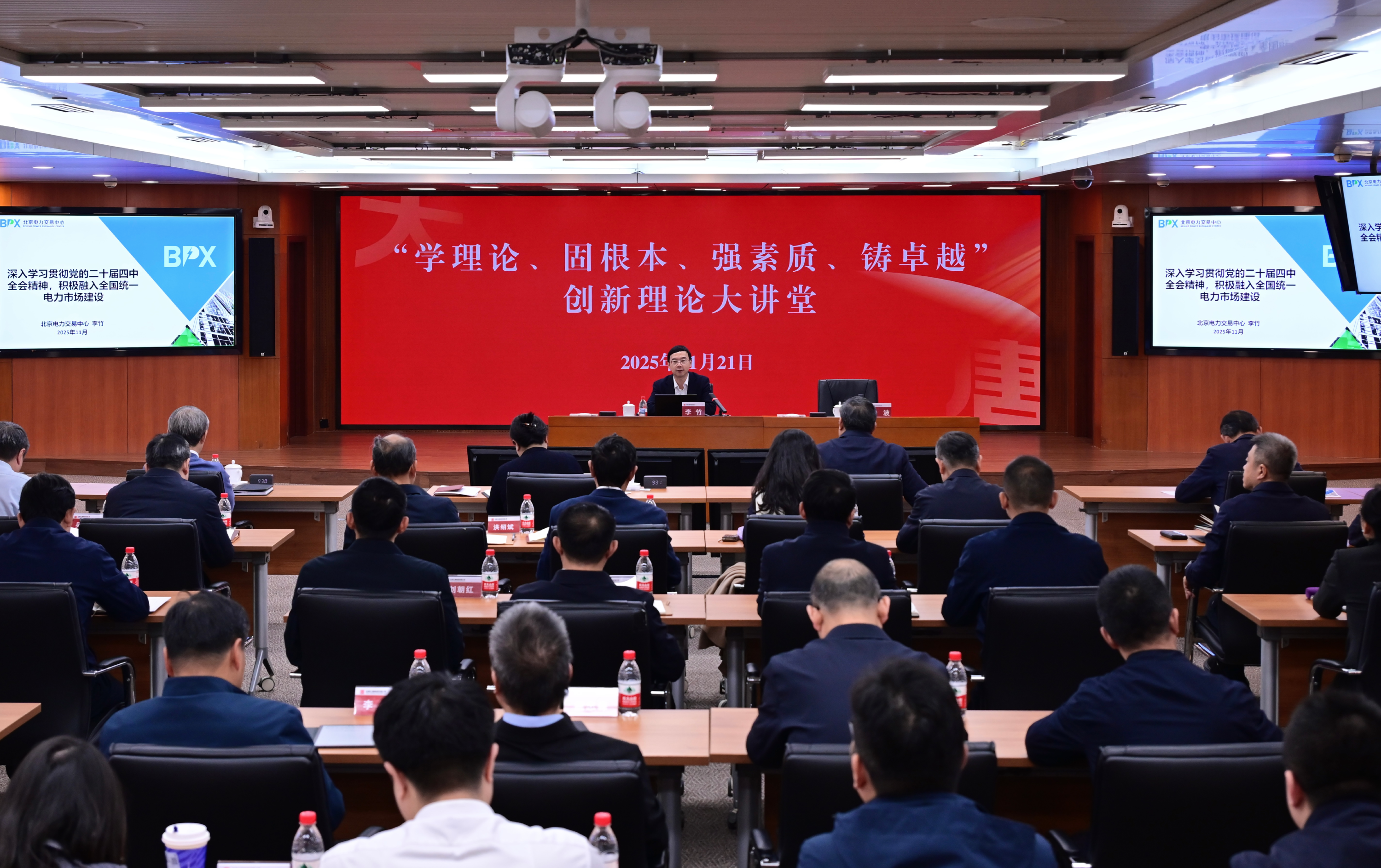 11月21日,中國(guó)大唐集團(tuán)有限公司“學(xué)理論、固根本、強(qiáng)素質(zhì)、鑄卓越”創(chuàng)新理論大講堂再度開(kāi)講,邀請(qǐng)北京電力交易中心有限公司副總經(jīng)理、能源行業(yè)電力市場(chǎng)技術(shù)標(biāo)準(zhǔn)委員會(huì)副主任委員李竹作《深入學(xué)習(xí)貫徹黨的二十屆四中全會(huì)精神,積極融入全國(guó)統(tǒng)一電力市場(chǎng)建設(shè)》專題講座。集團(tuán)公司董事、黨組副書記余波主持講座,集團(tuán)公司領(lǐng)導(dǎo)王瑛、曲波、陶云鵬、茍偉參加講座。